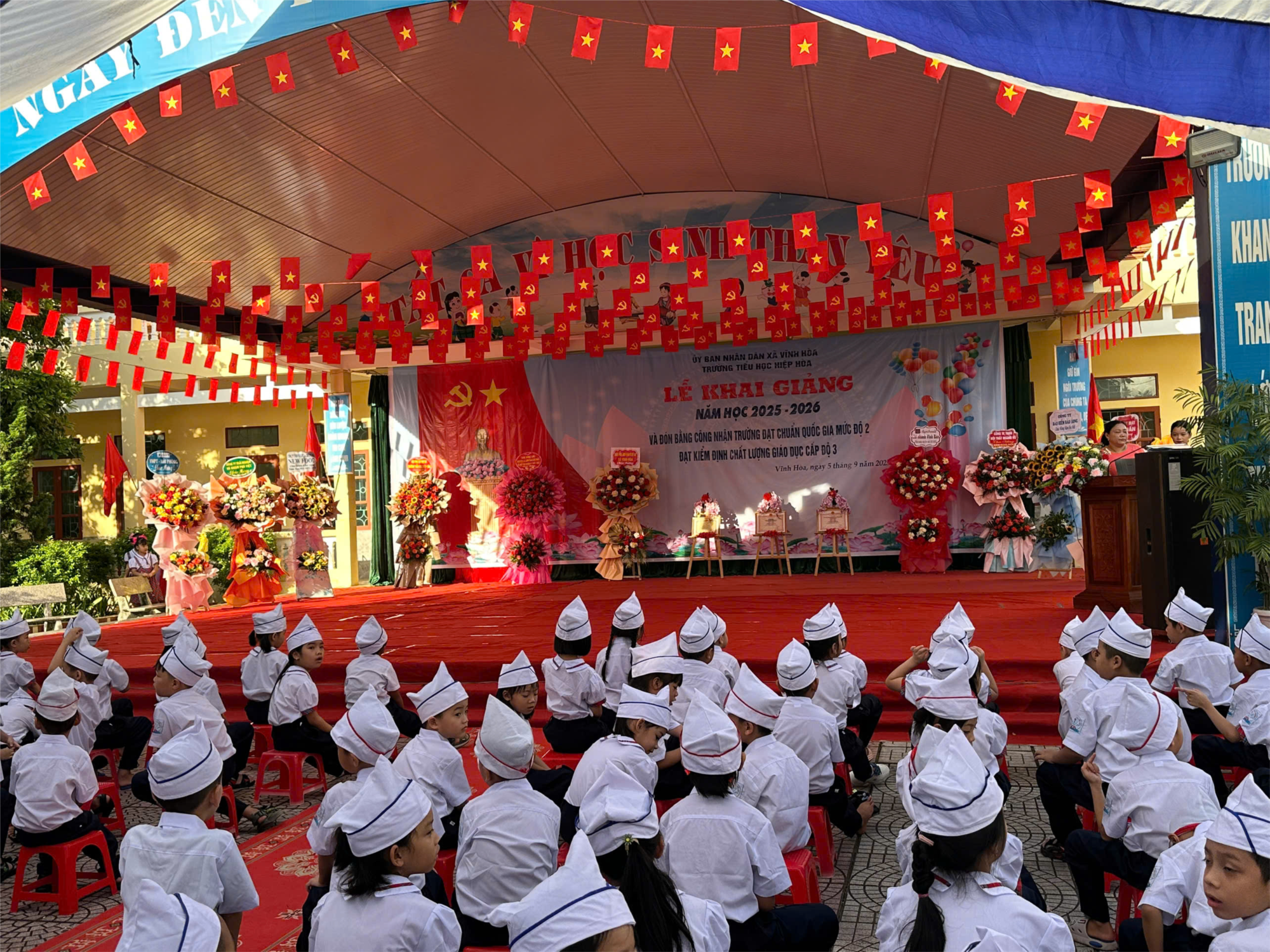 Đặc biệt, trong buổi lễ năm nay, Trường Tiểu học Hiệp Hòa vinh dự được đón nhận Bằng công nhận Trường đạt Chuẩn quốc gia mức độ 2 và Chứng nhận Kiểm định chất lượng giáo dục cấp độ 3 – một dấu mốc khẳng định sự nỗ lực không ngừng của thầy và trò, cũng như sự quan tâm, đồng hành của các cấp lãnh đạo và phụ huynh.
