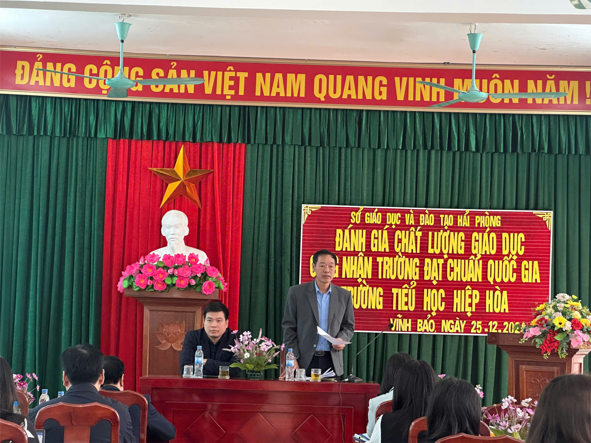 Đón đoàn kiểm tra có đồng chí Lê Ngọc Lân - PCT UBND huyện Vĩnh Bảo, đ/c Đoàn Văn Thành - Huyện uỷ viên - Trưởng phòng Phòng GD & ĐT, các đ/c lãnh đạo, chuyên viên PGD&ĐT huyện Vĩnh Bảo, các đ/c lãnh đạo ĐU, HĐND, UBND xã Hiệp Hoà cùng toàn thể Cán bộ, giáo viên, nhân viên, đại diện Cha mẹ học sinh, đại diện học sinh trường tiểu học Hiệp Hoà.