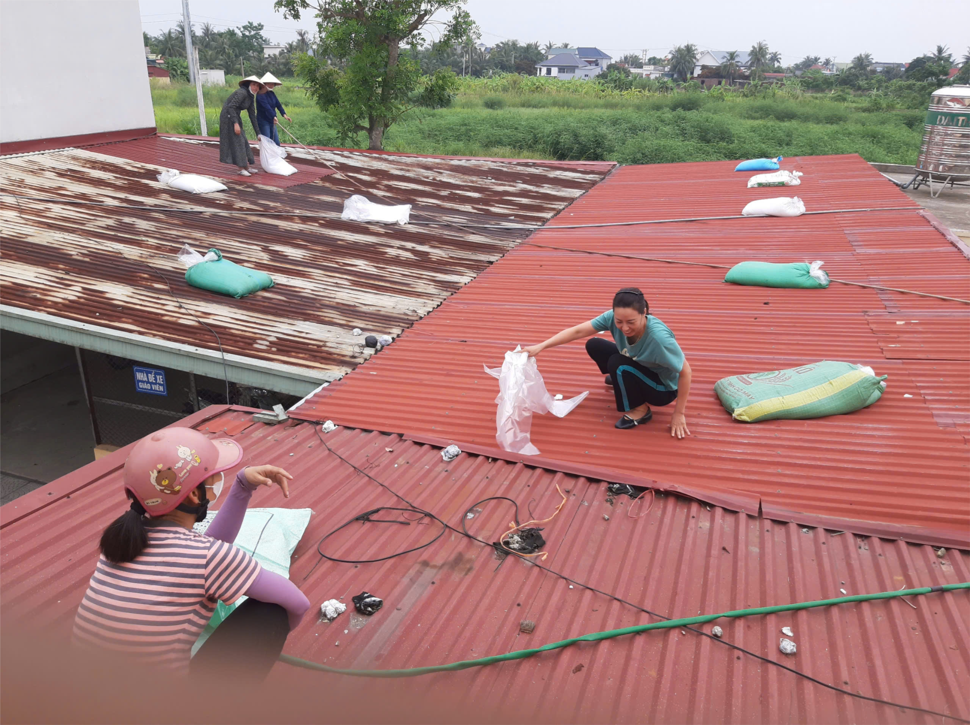 Thực hiện công điện số Số: 01 /CĐ-UBND của Chủ tịch UBND xã Vĩnh Hoà về việc tập trung ứng phó khẩn cấp bão số 3 năm 2025 ngày 20/07/2025 Trường Tiểu học Hiệp Hoà đã lập kế hoạch, ra thông báo và thành lập Ban chỉ đạo phòng chống cơn bão số 3. Ngay trong chiều ngày 20/07/2025 Ban phòng chống bão cùng các giáo viên trong trường đã gia cố, chằng chống mái che lợp tôn, khu nhà vệ sinh, các phòng học và các phòng chức năng khác. Ngoài ra, toàn thể giáo viên nhà trường thực hiện các công tác phòng chống khác như: ràng buộc các cửa sổ, chèn cửa đại, sắp xếp bàn ghế vào khu vực giữa phòng, lấy ni lông che phòng Tin, ti vi, máy tính… Không những thế Ban chỉ đạo phòng chống bão số 3 luôn túc trực kiểm tra và gia cố lại các công trình lớp học trong mưa bão. Sau đây là một số hình ảnh phòng chống bão: